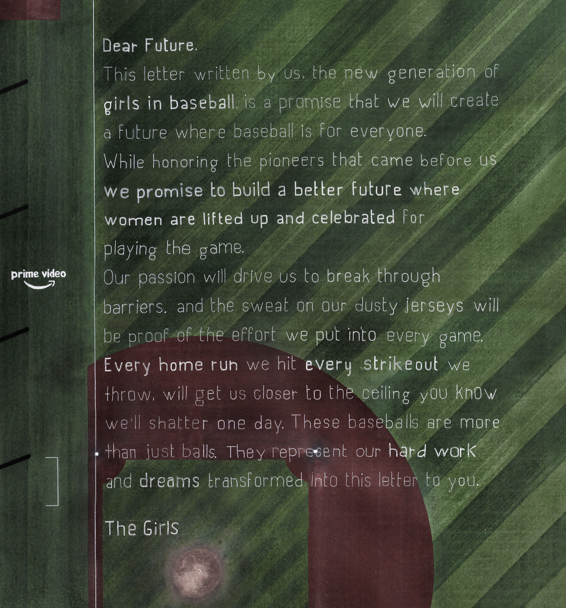 In addition to this letter of empowerment, we worked with Prime Video to host a baseball game featuring some well known names, including Abbi Jacobson, Kelsie Whitmore, Haley Cruse Mitchell, and many more. Not to mention the one & only Maybelle Blair, who played in the All-American Girls Professional Baseball League during the 1940s—and inspired A League of Their Own- who tossed out the first pitch.